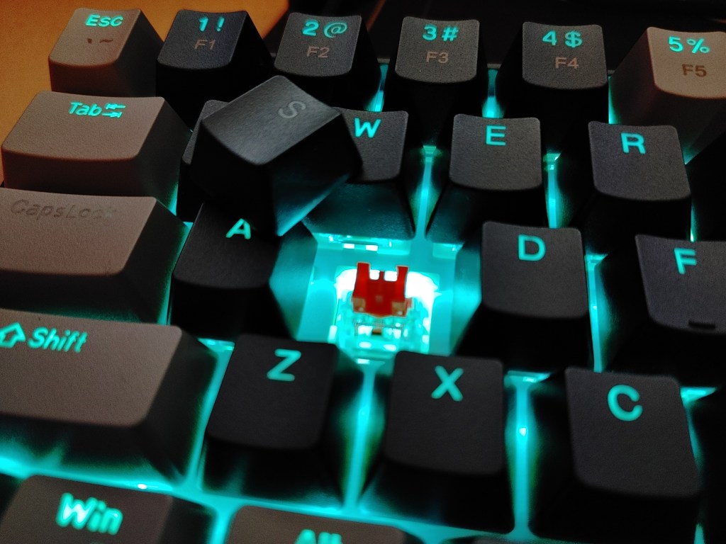 The key switches are non-hot swap Outemu box reds. Linear and similar to Gateron and CherryMX reds they feel decent to type on though they seem to have a bit more resistance the further down you push than I am used to. They are not as smooth as other linears I have used but again, not terrible. The keys are more stable than the Gamenote keyboard I previously reviewed which is a positive.