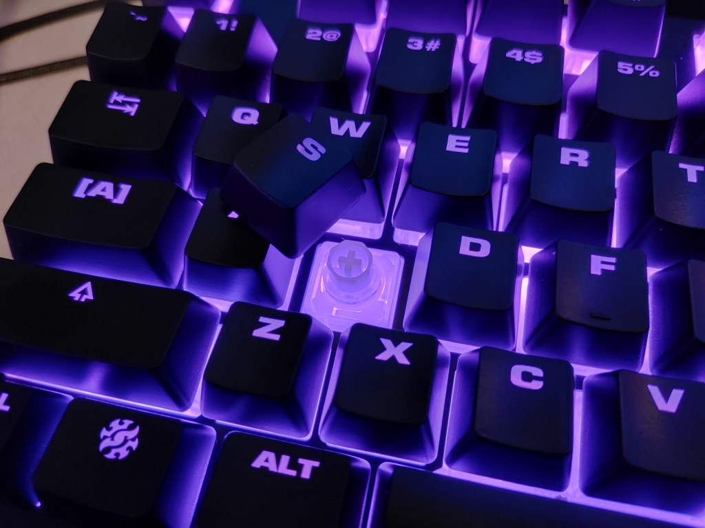 The keycaps are dye-subbed shine-through ABS plastic which means after a lot of typing the black paint on them will wear off. The legends are decidedly gamer focused with a futuristic bold font. The font used here is very close to too much for me and it does go overboard on the Caps lock.