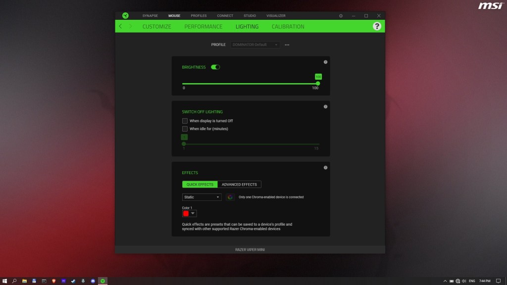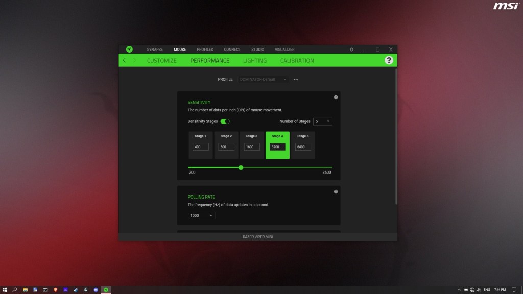 The skates are very good at sliding smoothly over my desk mat. And Razer’s optical sensor here is really good as well. It’s smooth and not aggressively accelerated. The sensor can be customized at 5 levels of DPI all the way up to 8500. There is no feedback for what level of DPI you are set to unless you have the Razer Synapse software installed. If the software is installed a notification will pop up showing what DPI you are set to.