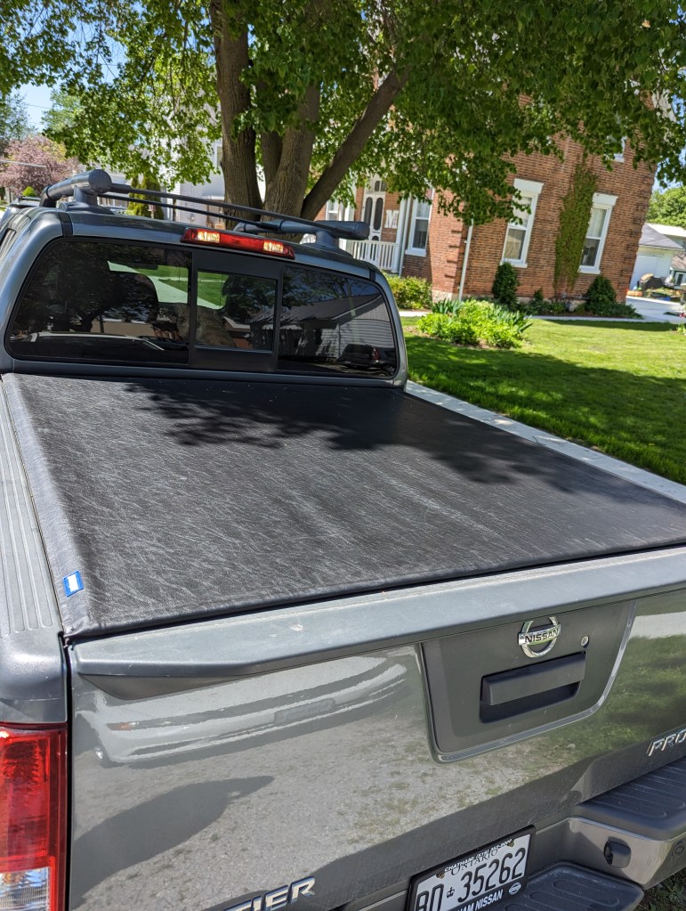 Since my last update I have removed the Nissan factory tri-fold tonneau as it was rubbing against the rear of the cab. In some spots the wear was severe enough that I had to buy a good amount of touch-up paint to cover it all back up. In it’s place I installed a Tonno Pro Lo-Roll cover. There were three reasons for installing this. One, I still wanted a cover over the box so I could keep things in the box relatively secure. Second, I wanted to preserve the mileage increasing properties that the cover provides. The third reason was so I could install a Modular Bed Rack produced locally by Overland Racks Ontario. This rack, while friendly to tonneau covers, still requires that less than an inch of the sides are covered by the cover. The Lo-Roll goes up the sides and doesn’t overlap the box sides at all.