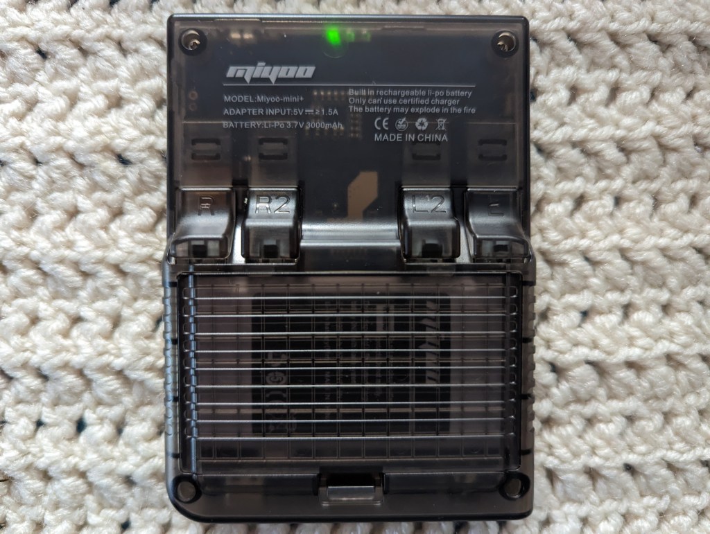 Around back you can see the Miyoo branding and below that the L1, L2, R1, R2 buttons. In an attempt to make the 1 and 2 levels of these buttons easier to tell apart Miyoo has raised the 2 buttons. In practice this rarely really made any difference to me as I never touched the 2 buttons at all. They do act as a nice place to rest fingers though since the device is so compact. They are also decent to press on only required a little travel to activate the switches below them. Below those buttons is the battery compartment housing the decently sized 3000 mAh battery. I appreciate Miyoo making it easy to access the battery without opening the whole device up.