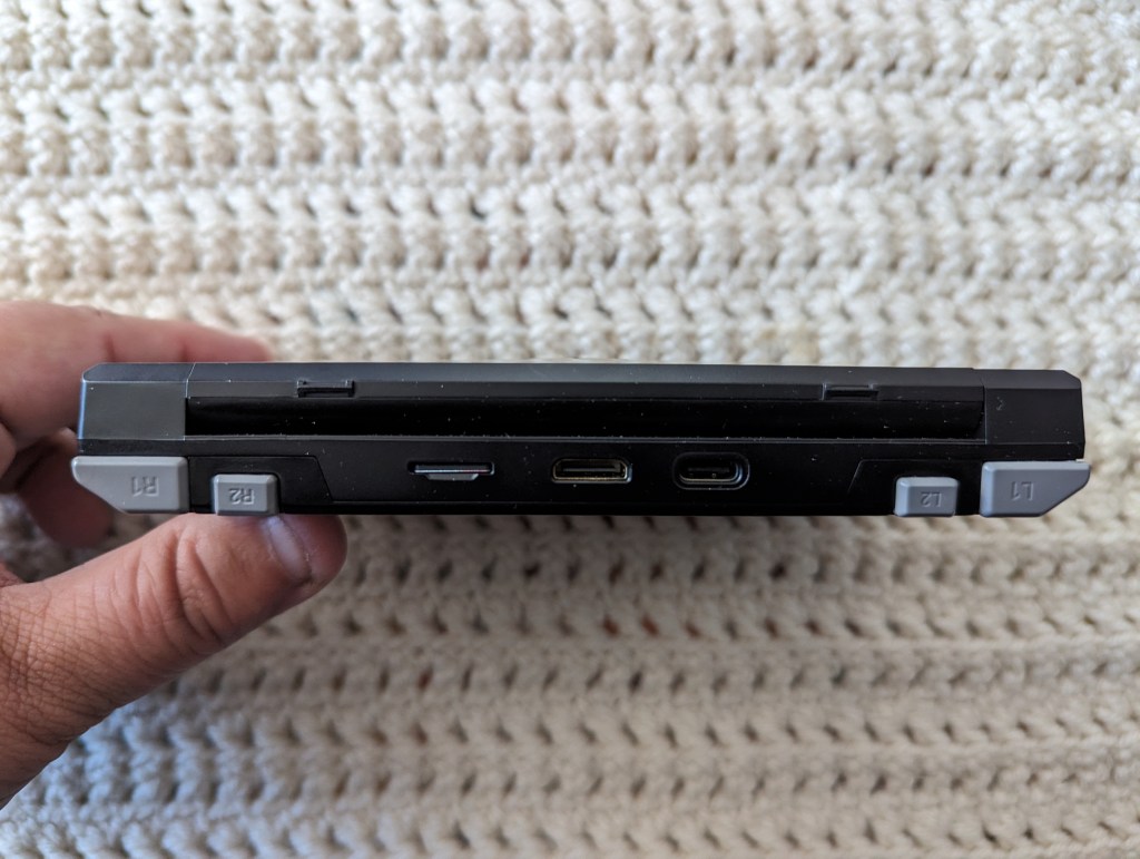The x18s looks pretty when slick closed. On top and centred among the black fascia is a red emblem that lights up when the device is powered on. Both the left and right side are devoid of any details. The back has the unit’s L1/L2 and R1/R2 buttons. The L1 and R1 buttons feel like they are analogue triggers but they are not. Instead they have some travel before you ultimately click a microswitch beneath. The L2 and R2 buttons just go down enough to click their own microswitch. In between them we have a micro-sd card slot, mini HDMI port and the unit’s USB-C charge port. On the front we have the two speakers behind some funky chrome speaker covers and in the centre a 3.5mm headphone jack.